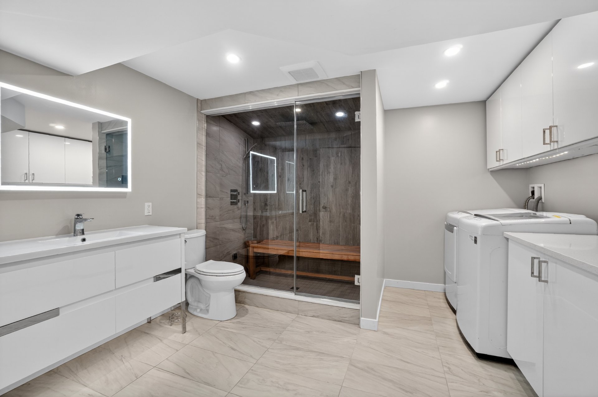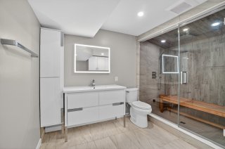- Basement fully finished (2021--2025) with family room and luxury bathroom featuring steam shower, heated floors, and Schluter waterproofing system