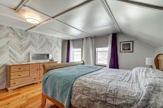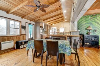 Propriété de 1 100 pi² à aire ouverte. 1 chambre, véranda pouvant servir de bureau ou 2e chambre, 1 salle de bain et 1 salle d'eau. Cuisine avec dosseret en céramique et rangement. Poêle à bois, planchers de bois sur deux étages, plafonds avec poutres apparentes. Salon avec grande fenestration. Chambre principale avec walk-in et salle d'eau attenante. Toiture en tôle, revêtement en bois, galerie couverte sur trois côtés, trois remises. Aucun voisin à l'arrière. À distance de marche du quai municipal du Lac Vert, des services du village et du sentier de l'Albatros. À seulement 35 minutes de Buckingham !
